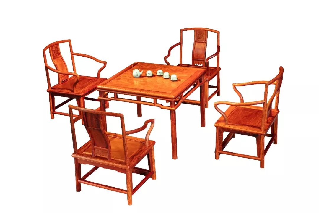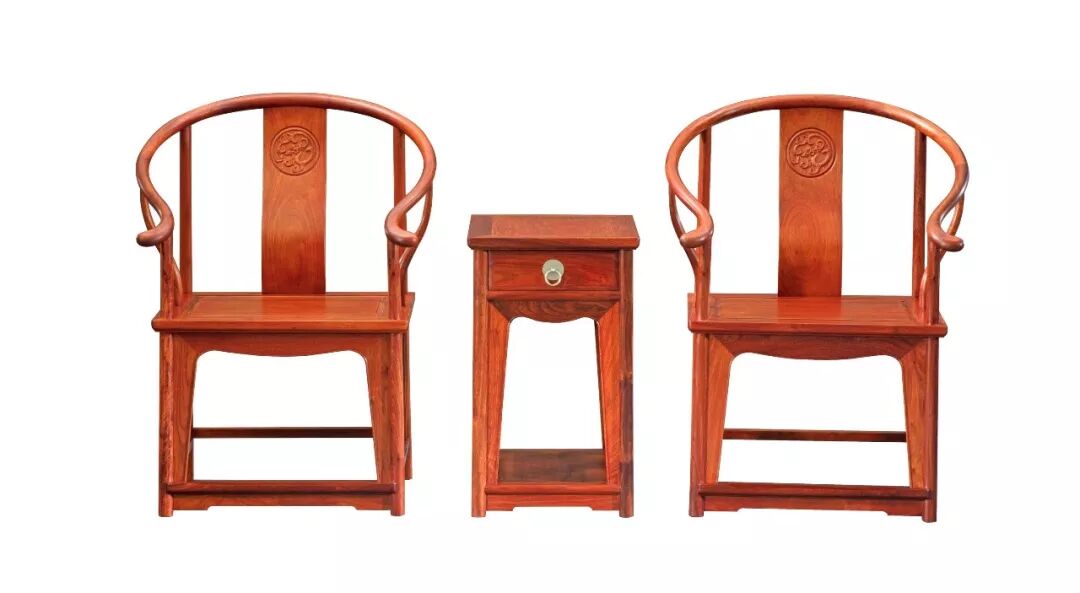 紅木座椅三件套為兩把圈椅配一個(gè)小茶幾,茶幾造型同椅互為呼應(yīng)。三件套通體圓潤,素雅大方,用料考究,做工精湛,為紅木家具之典型。