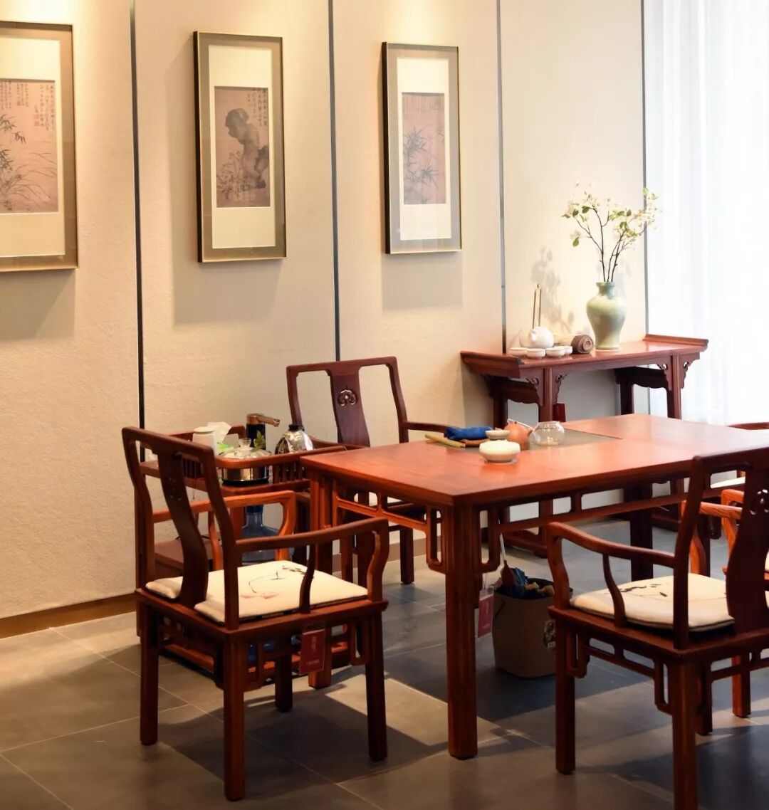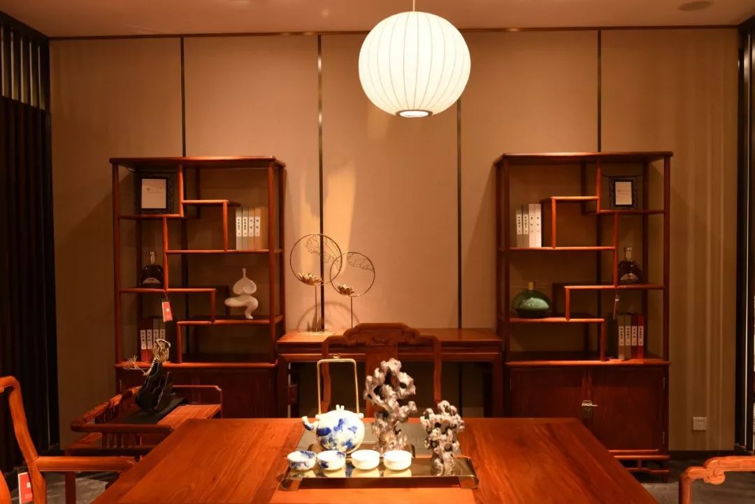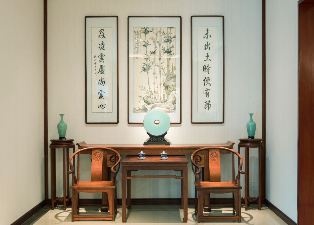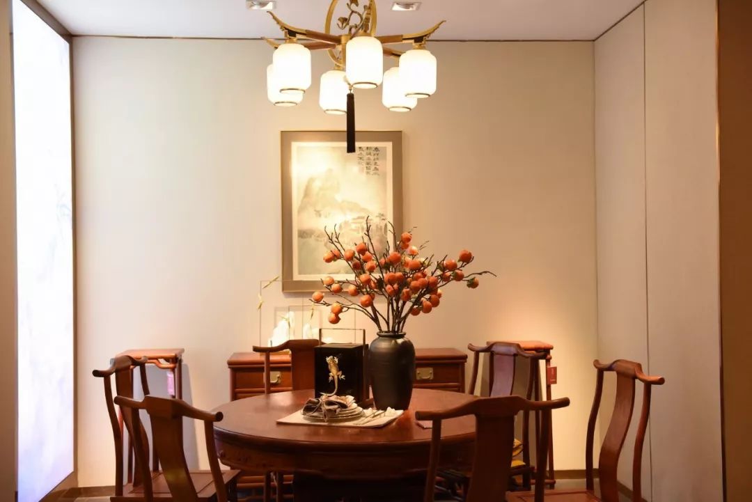 此外,在現(xiàn)代中式空間里,桌類家具的鋪陳也呈現(xiàn)出充裕的視覺張力。擺設成堂配套桌椅組合,或原有形制上改進的一種桌式,根據(jù)實際空間和使用習慣出發(fā),重點把握色彩關系和材質關系,講究每一個細節(jié)的搭配,能夠衍生出沉穩(wěn)而大氣的氛圍。